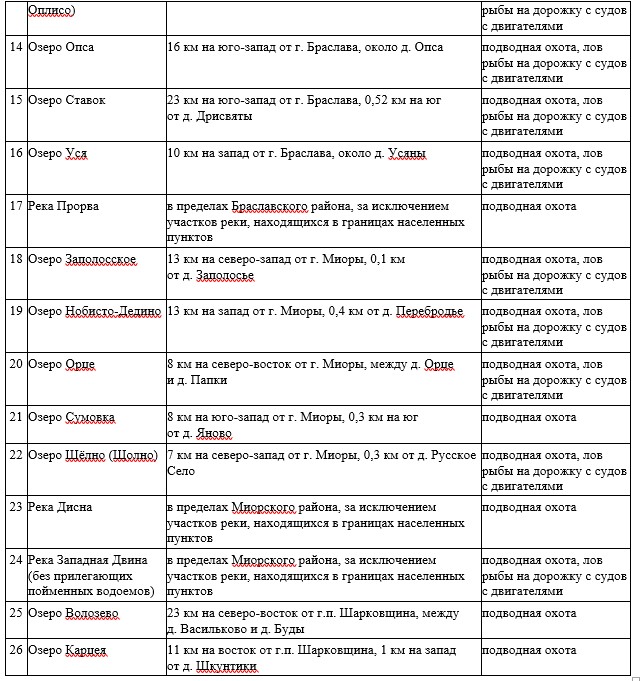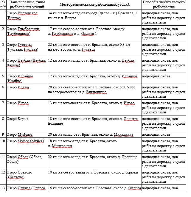 На территории зоны ответственности Браславской межрайонной инспекции охраны животного и растительного мира (Браславкий, Миорский, Шарковщинский районы) данные водоёмы предоставлены в таблице.