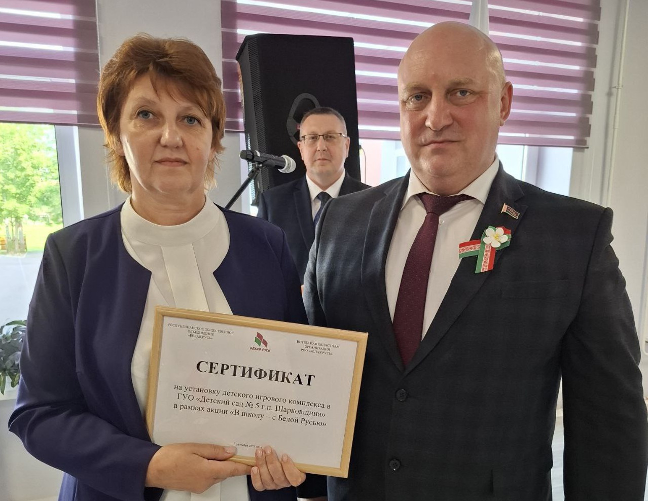 Сертыфікат на яго набыццё ва ўрачыстай атмасферы ўручыў загадчыку дашкольнай установы Ірыне Шук старшыня абласнога Савета дэпутатаў, старшыня абласной арганізацыі РГА «Белая Русь» Дзмітрый Дзямідаў.