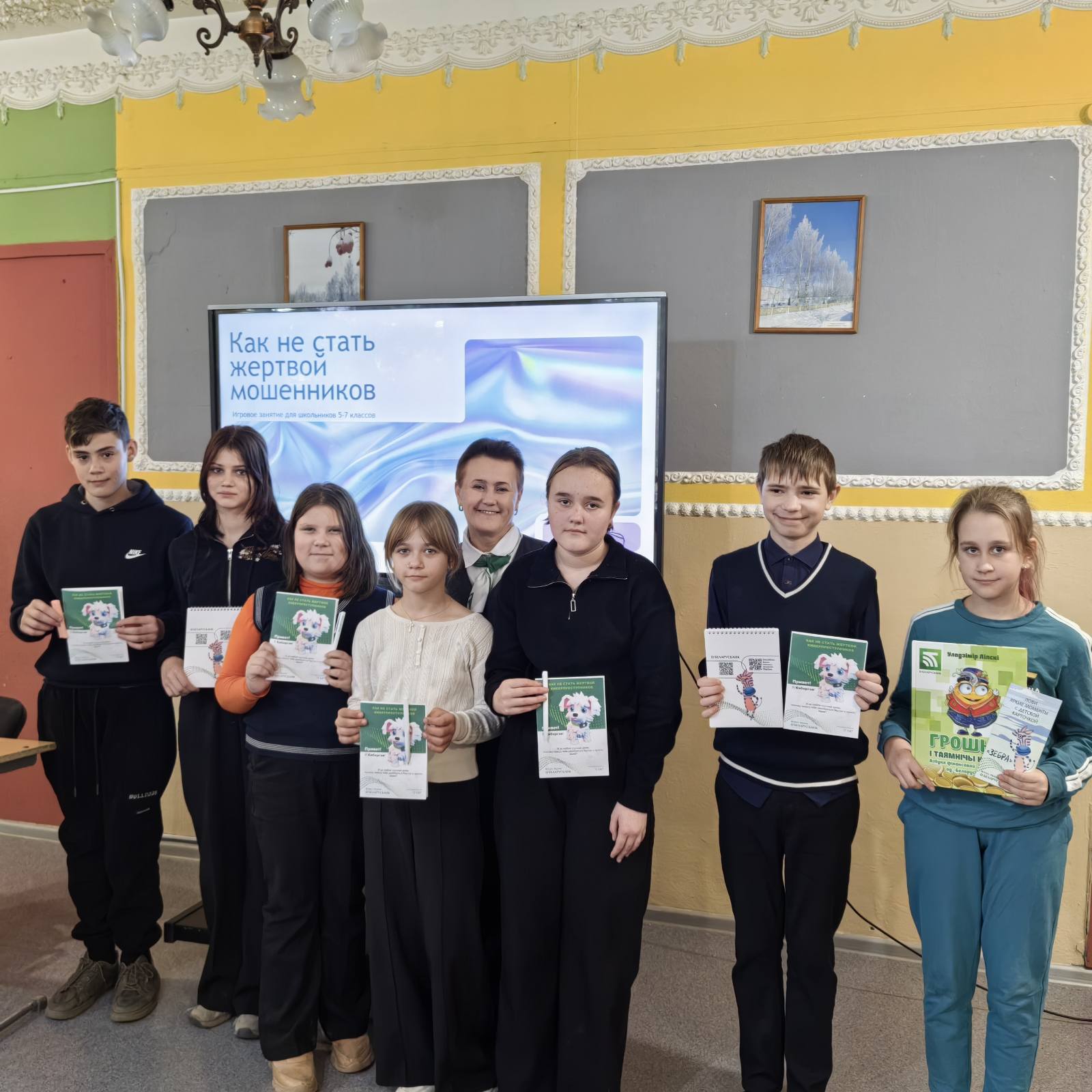 Проведены презентации на тему «Банковские продукты для детей» и «Как не стать жертвой мошенничества», викторины. Самые активные участники урока получили сувенирную продукцию банка, всем молодым людям была вручены рекламные буклеты.