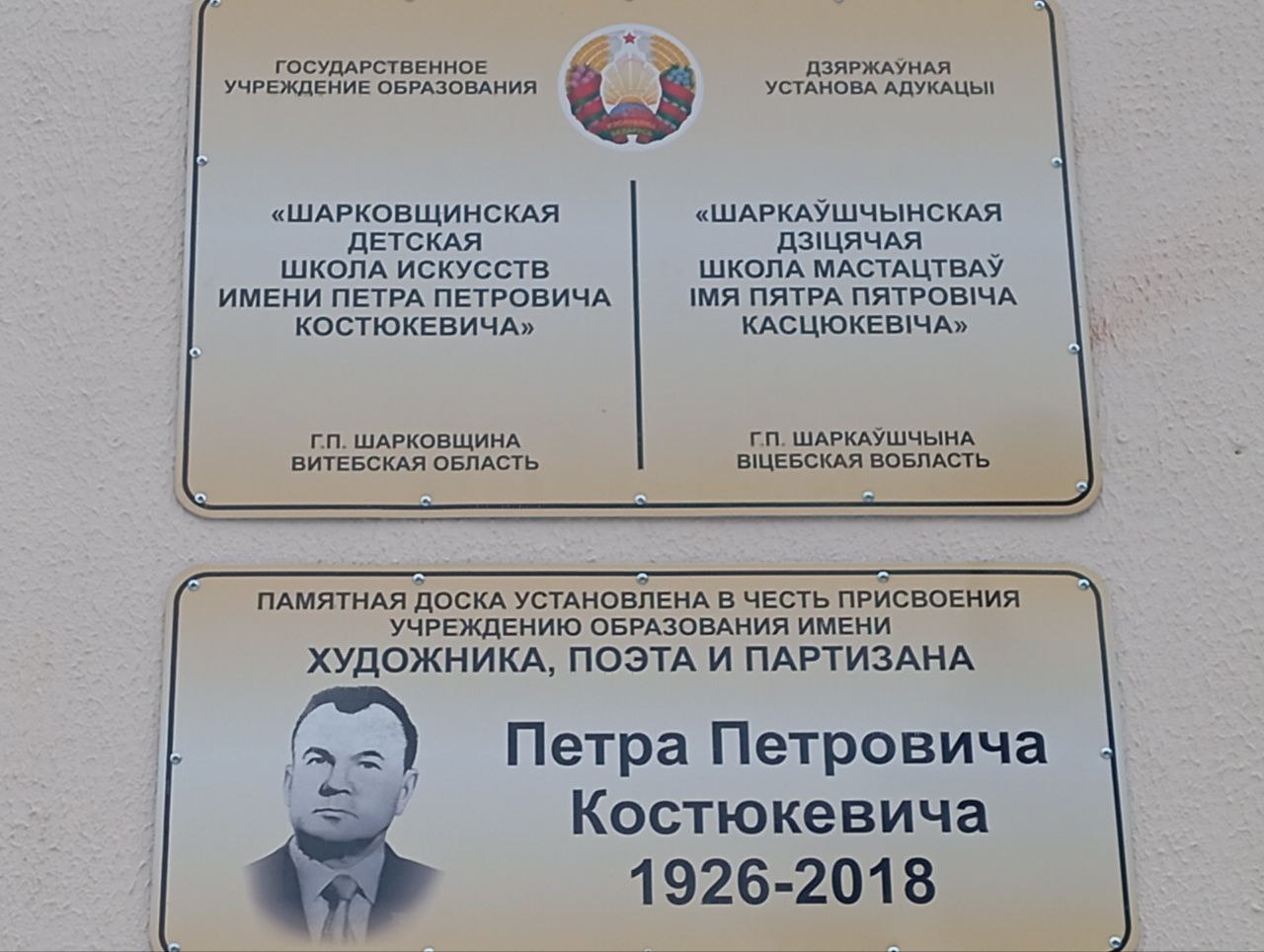 У Шаркаўшчынскай дзіцячай школе мастацтваў урачыста адкрылі памятную дошку, усталяваную ў гонар нашага земляка, партызана, мастака, паэта Пятра Касцюкевіча, імя якога носіць установа. Удзел ў мерапрыемстве прымае старшыня раённага Савета дэпутатаў Сяргей Арэшкаў.