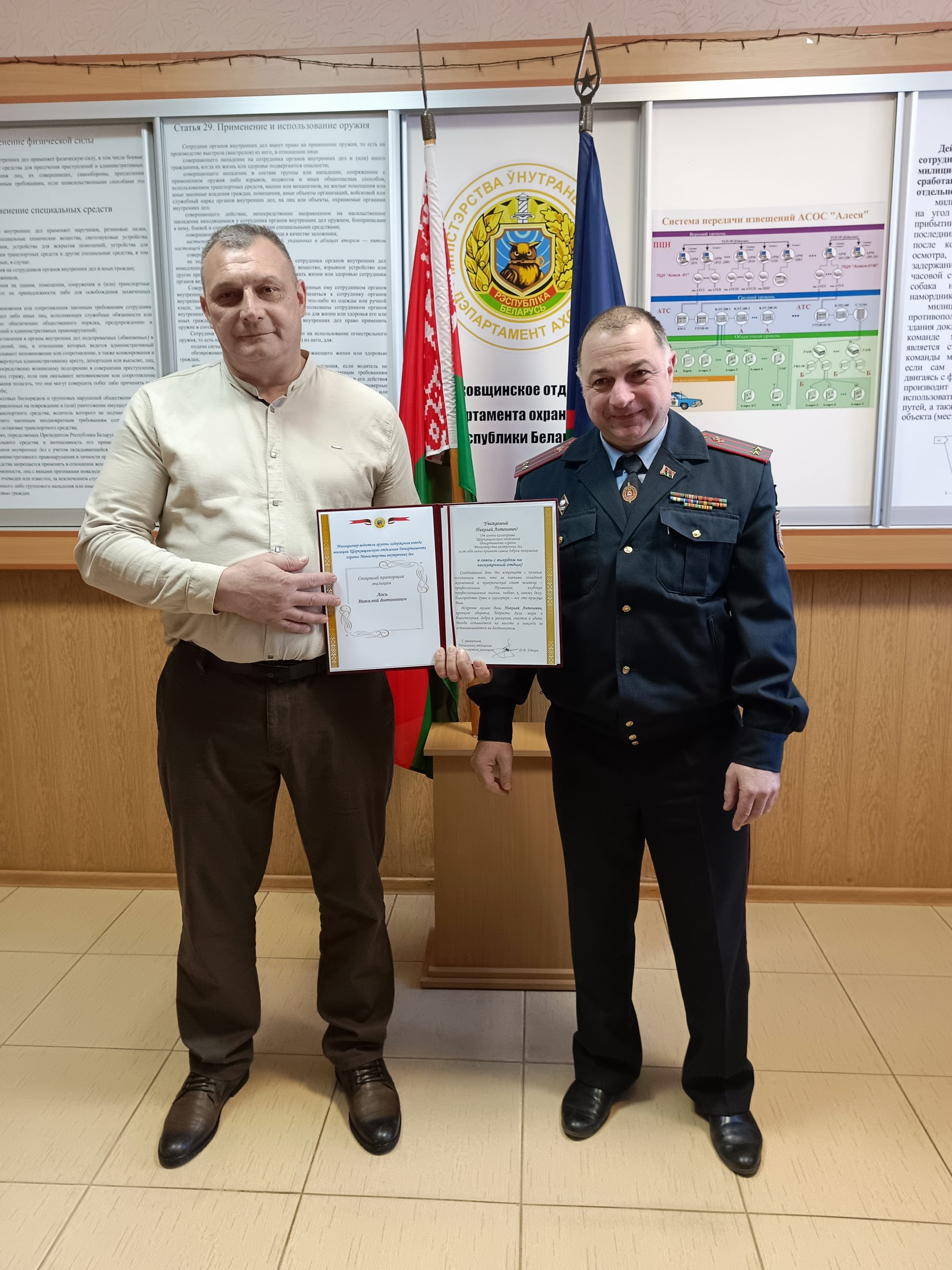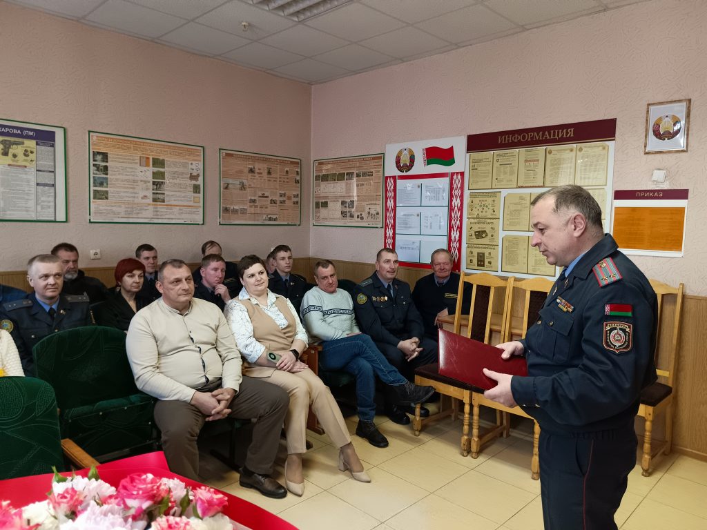 29 января 2026 года в Шарковщинском отделении Департамента охраны Министерства внутренних дел проводили на заслуженный отдых милиционера-водителя группы задержания взвода милиции старшего прапорщика милиции Николая Лося.