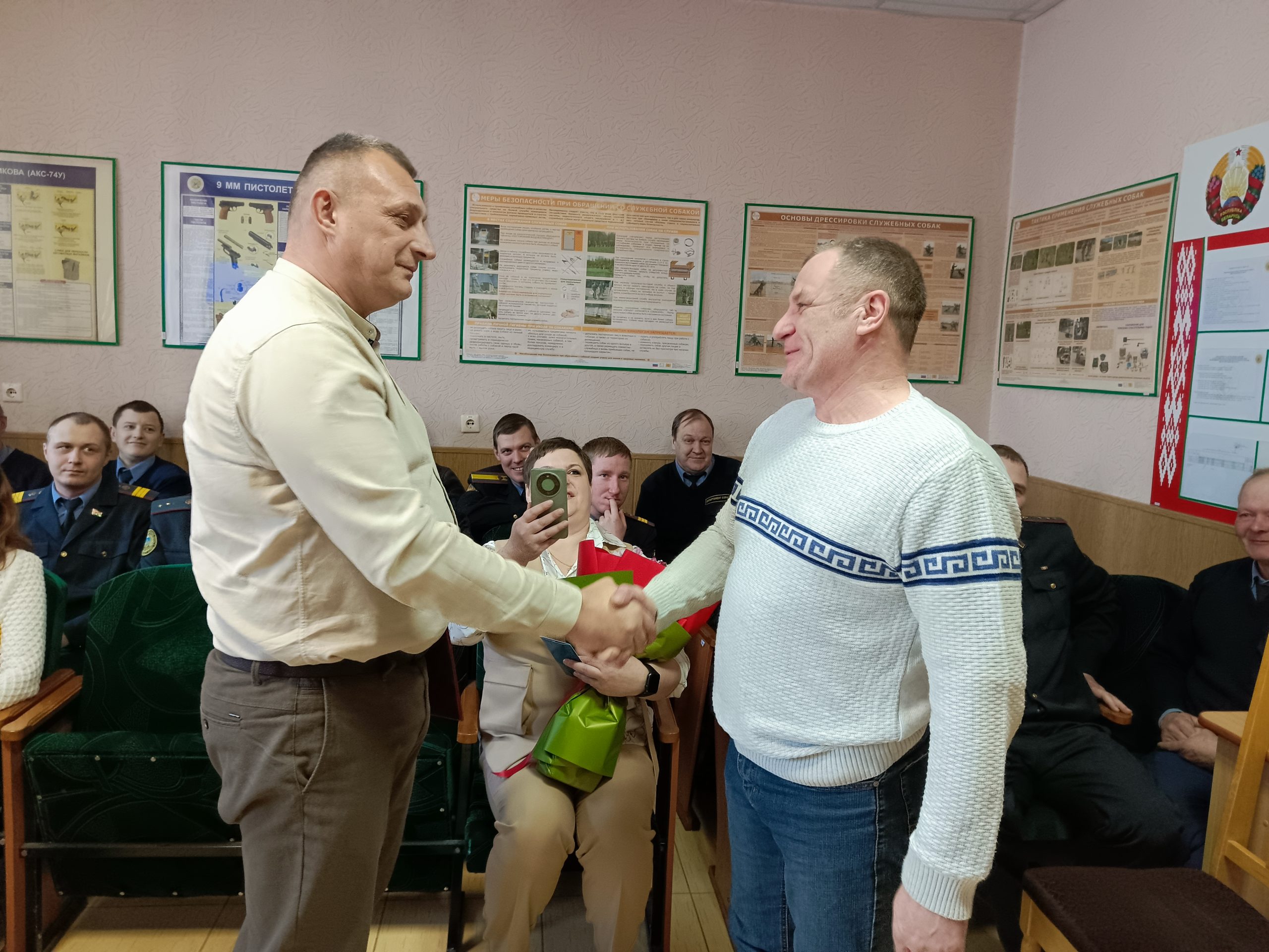 В актовом зале собрались коллеги, друзья и близкие, с которыми Николай Антонович на протяжении долгих лет делил службу. С поздравительным словом выступил начальник Шарковщинского отделения Департамента охраны Уткин Дмитрий Васильевич. В его словах звучала искренняя благодарность Николаю Антоновичу за пройденный путь, за все успехи, за старания, внимание, безусловную отдачу и абсолютную любовь к своему делу.