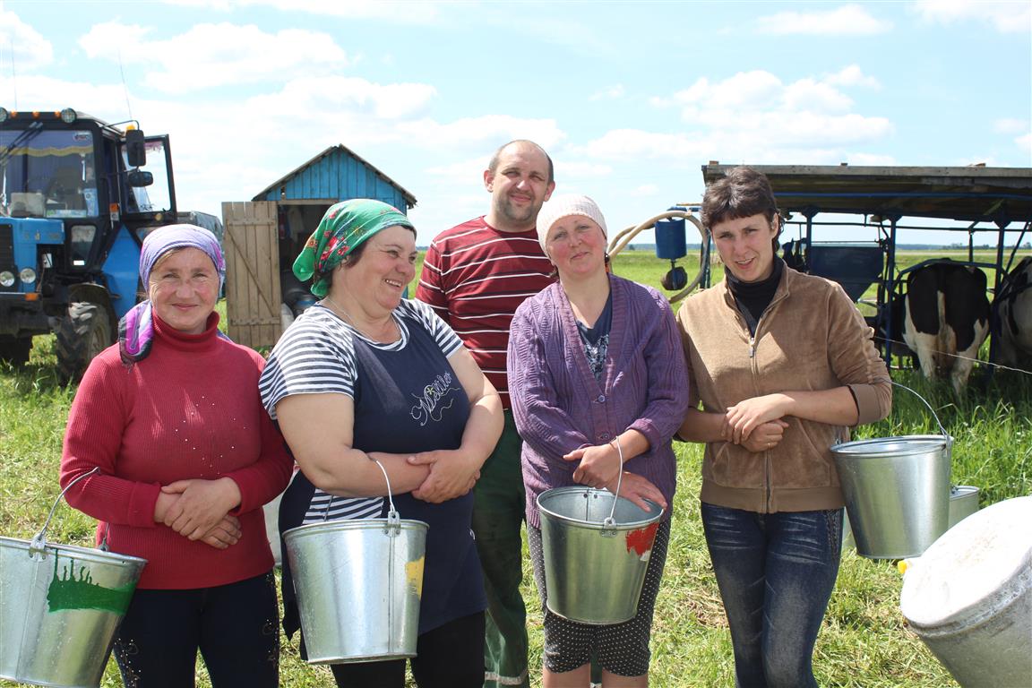 На даенне аператараў машыннага даення Раісу Коласаву, Кацярыну Лаздыньш, Алёну Слуцкую і Яўгенію Дарожка прывёз механізатар Сяргей Палягошка. Перад пачаткам работы яны згадзіліся сфатаграфавацца, каб потым хуценька ўзяцца за працу і атрымаць чарговы сырадой ад сваіх кароў.