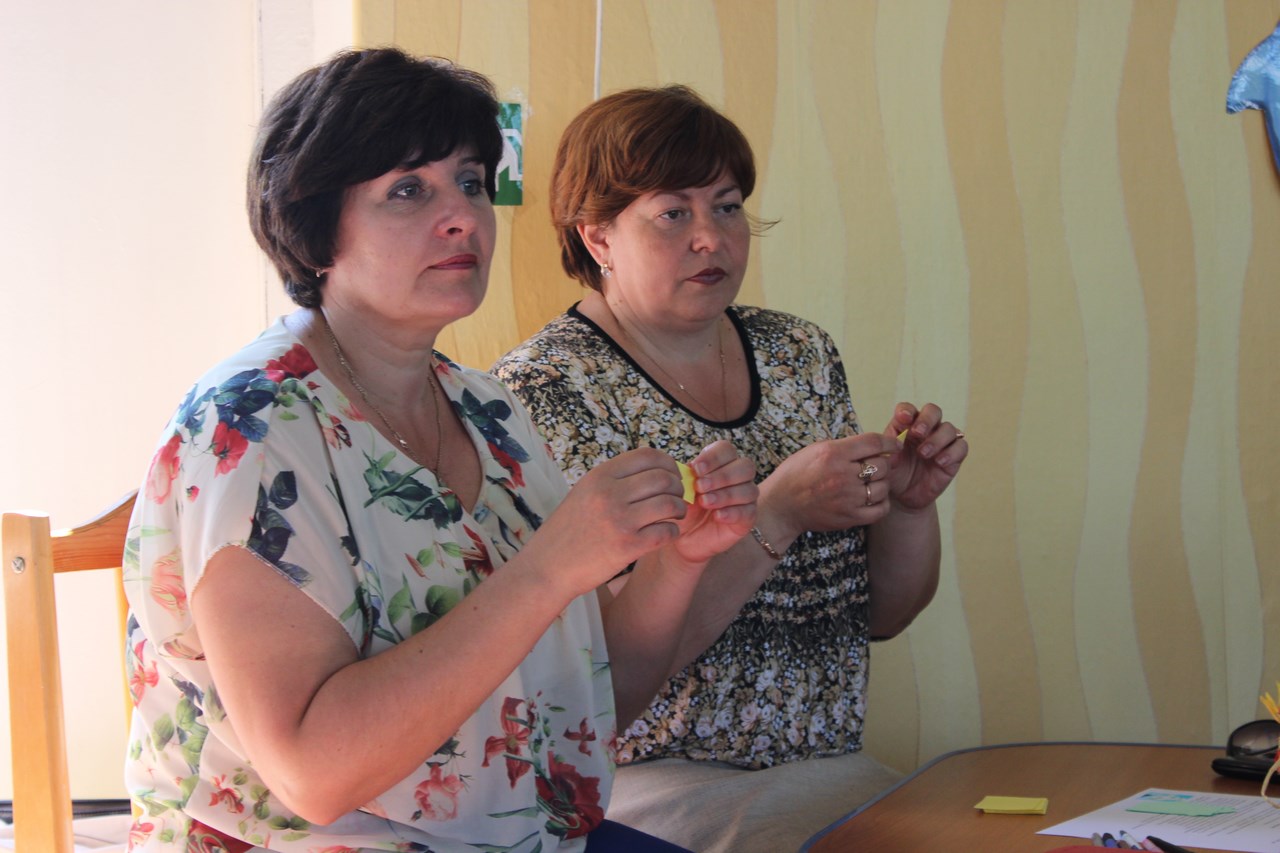 Воспитатель яслей-сада № 3 г. п. Шарковщина Ольга Леонидовна Подорская продемонстрировала фитнес-танец с использованием нестандартного оборудования — степ-платформы, а воспитатель яслей-сада № 1 Юлия Курилович провела мастер-класс по составлению объемных фигур модульного оригами. Участники мероприятия охотно приняли в нем участие, а также в игре-релаксации «Картина пожеланий».