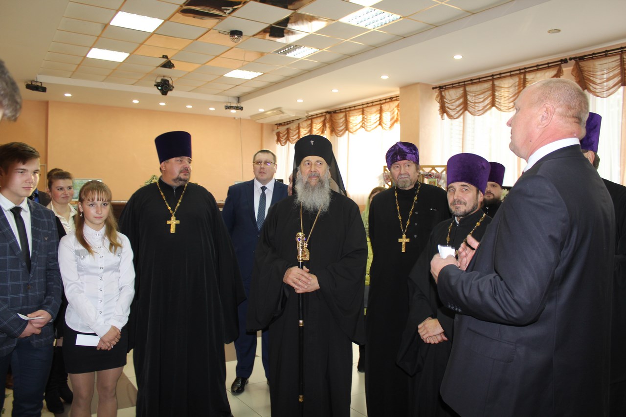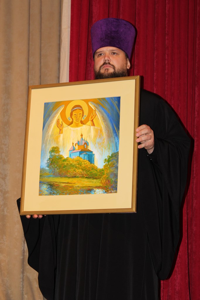 — Сёлета горад Полацк адзначае тры знакавыя падзеі, — сказаў са сцэны ўладыка Феадосій, — гэта, у першую чаргу, 1025-годдзе заснавання Полацкай епархіі, 500-годдзе беларускага кнігадрукавання і 1155-гадовы юбілей з моманту першага пісьмовага ўпамінання горада. Архіепіскап заклікаў прысутных найчасцей наведваць храмы, у малітвах успамінаць Бога, любіць і паважаць сваіх родных і блізкіх людзей. Юрый Анатольевіч Васілеўскі ўручыў уладыку Феадосію карціну з выявай Свята-Успенскай царквы і анёла-ахоўніка, напісаную выкладчыкам дзіцячай школы мастацваў Віктарам Фёдаравічам Круком.