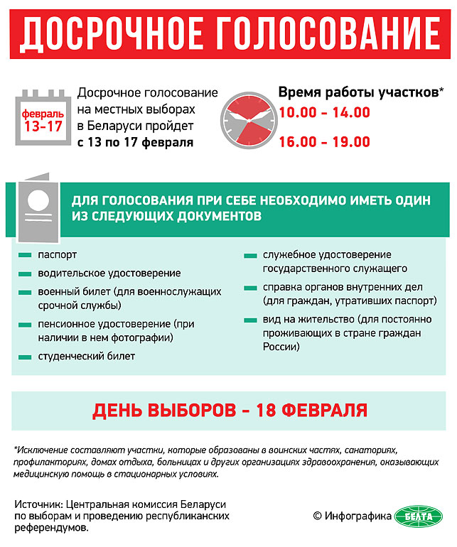 Досрочное голосование на выборах депутатов местных Советов 28-го созыва началось сегодня в Беларуси, сообщает БЕЛТА. Проголосовать досрочно можно будет по 17 февраля включительно с 10.00 до 14.00 и с 16.00 до 19.00. Как пояснили в Цетризбиркоме, такое право предоставлено избирателям, которые в день выборов не будут находиться по месту своего жительства. При этом официального подтверждения причин невозможности прийти на участок для голосования в день выборов не требуется. Тем, кто 18 февраля, будет за рубежом, в ЦИК рекомендуют при наличии возможности проголосовать досрочно, поскольку в отличие от выборов Президента и депутатов Палаты представителей на выборах в местные Советы создание участков для голосования за пределами страны не предусмотрено.