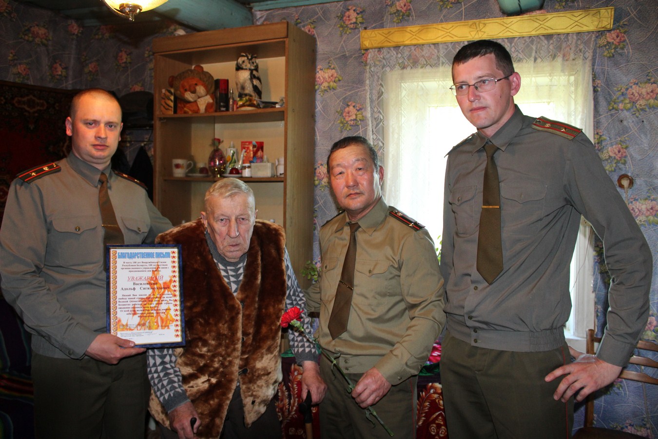 Напярэдадні Вялікага дня Перамогі ветэрана Вялікай Айчыннай вайны наведалі начальнік абасобленай групы ваеннага камісарыята Глыбоцкага і Шаркаўшчынскага раёнаў Дзмітрый Фёдаравіч Жораў, намеснік ваеннага камісара па тэрытарыяльнай абароне Андрэй Сяргеевіч Каштальян і старшыня раённай арганізацыі Беларускага саюза афіцэраў Валерый Інакенцьевіч Ан. У сувязі са святкаваннем Дня Перамогі яны ўручылі ветэрану кветкі і Падзячнае пісьмо і пажадалі яму здароўя і доўгіх год жыцця.