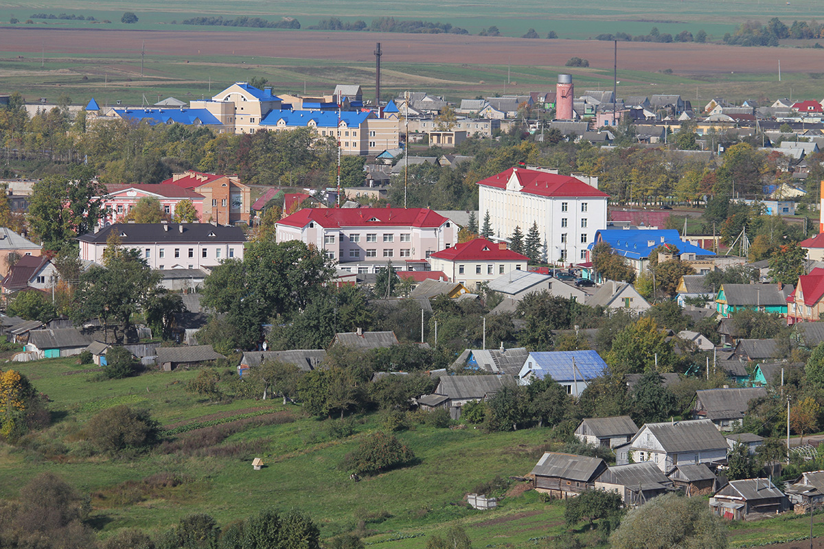 На гербе нашага гарадскога пасёлка бачыш стылізаваную старажытную браму з чырвонай цэглы. А зверху і знізу — яскравыя ягады журавін.