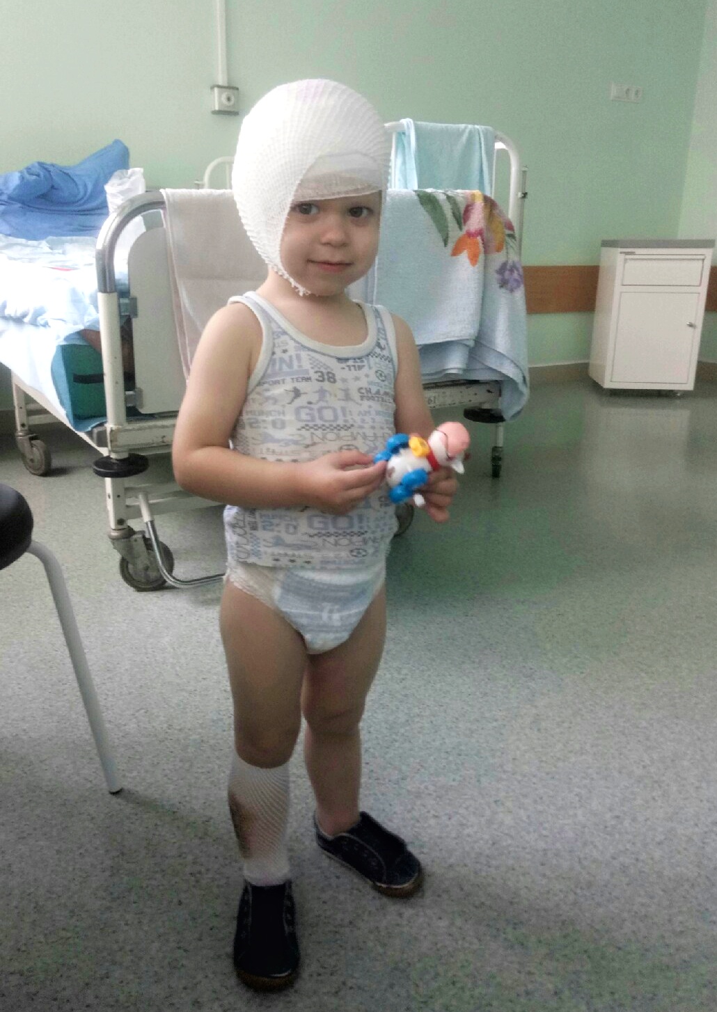 Кирилл вместе с мамой правел два с половиной месяца в больнице. Он перенес две трансплантации кожи, операцию по извлечению импланта.