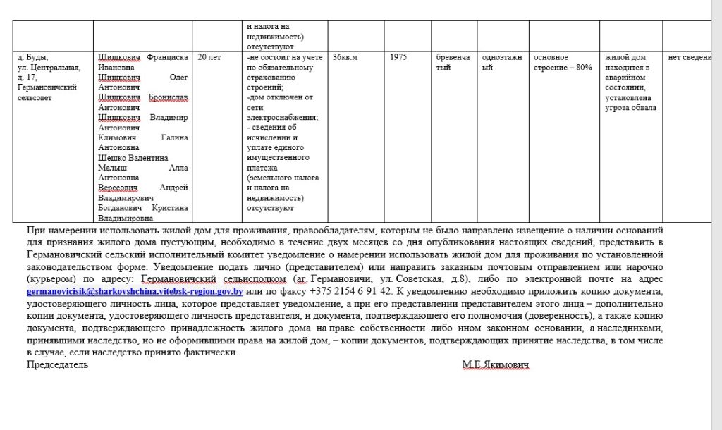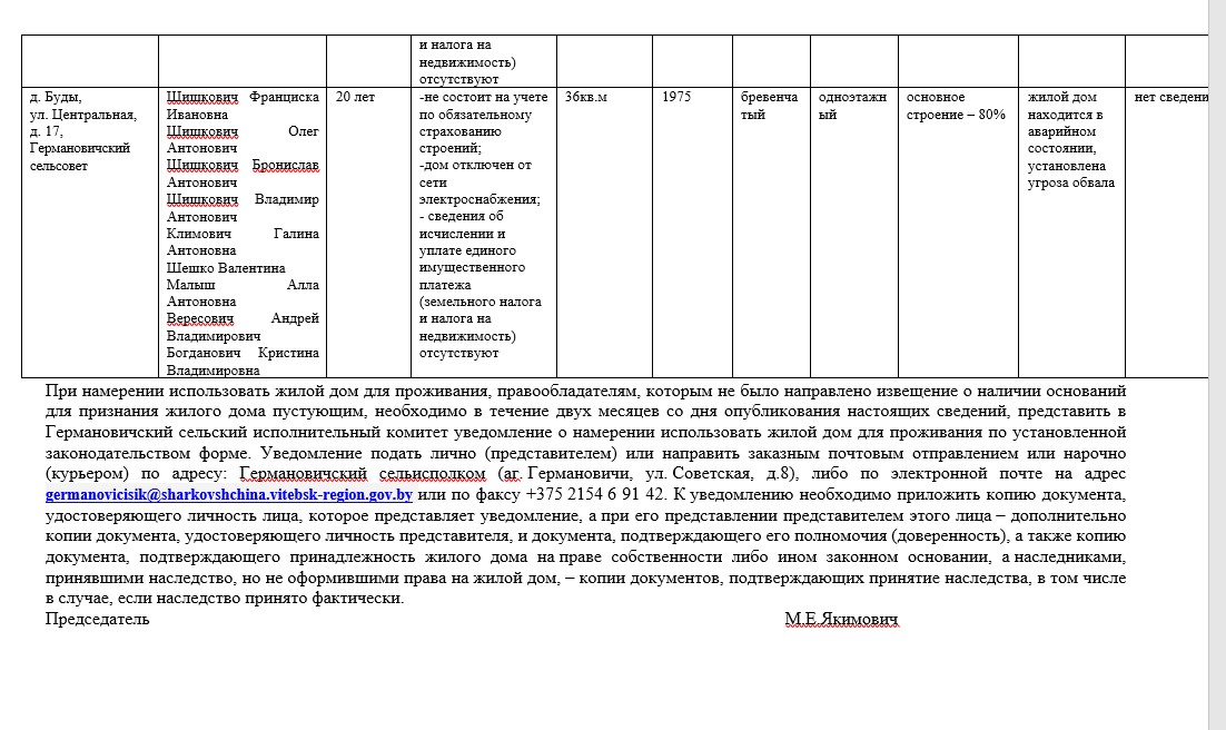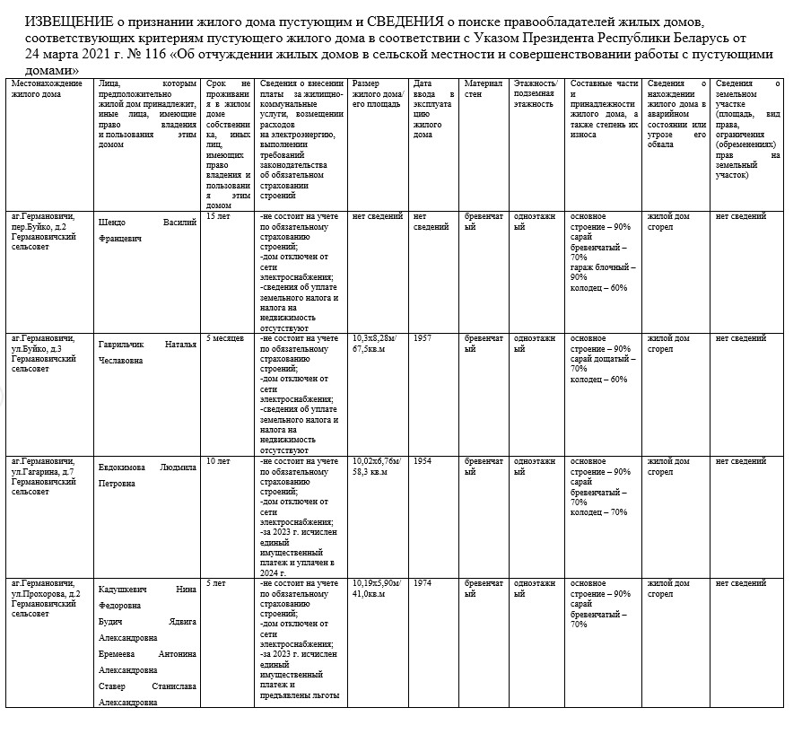 ИЗВЕЩЕНИЕ о признании жилого дома пустующим и СВЕДЕНИЯ о поиске правообладателей жилых домов, соответствующих критериям пустующего жилого дома в соответствии с Указом Президента Республики Беларусь от 24 марта 2021 г. № 116 «Об отчуждении жилых домов в сельской местности и совершенствовании работы с пустующими домами»