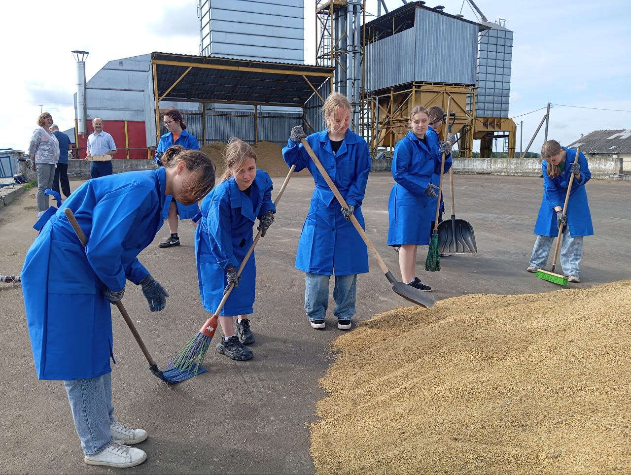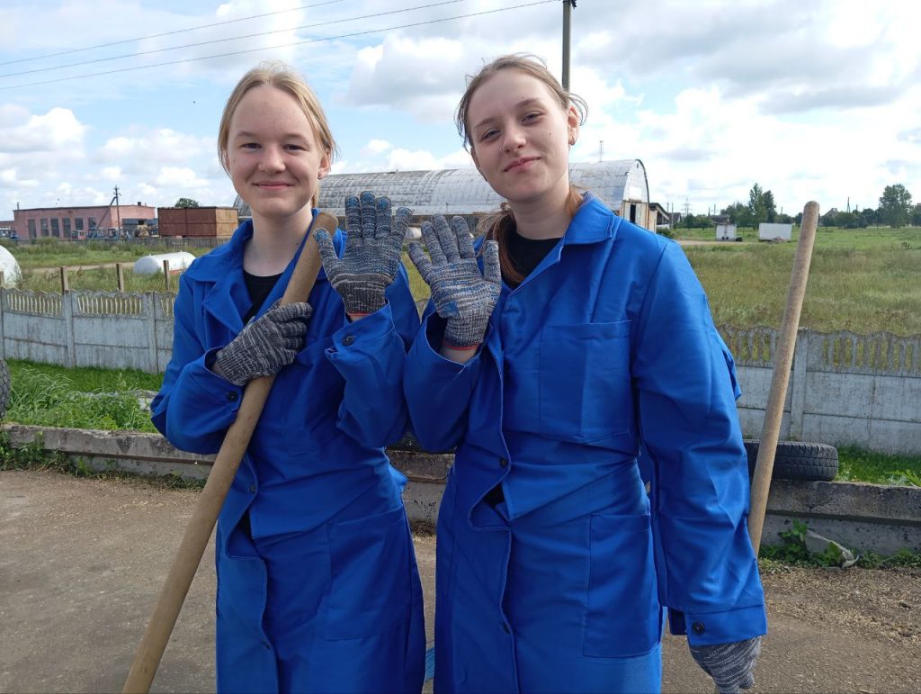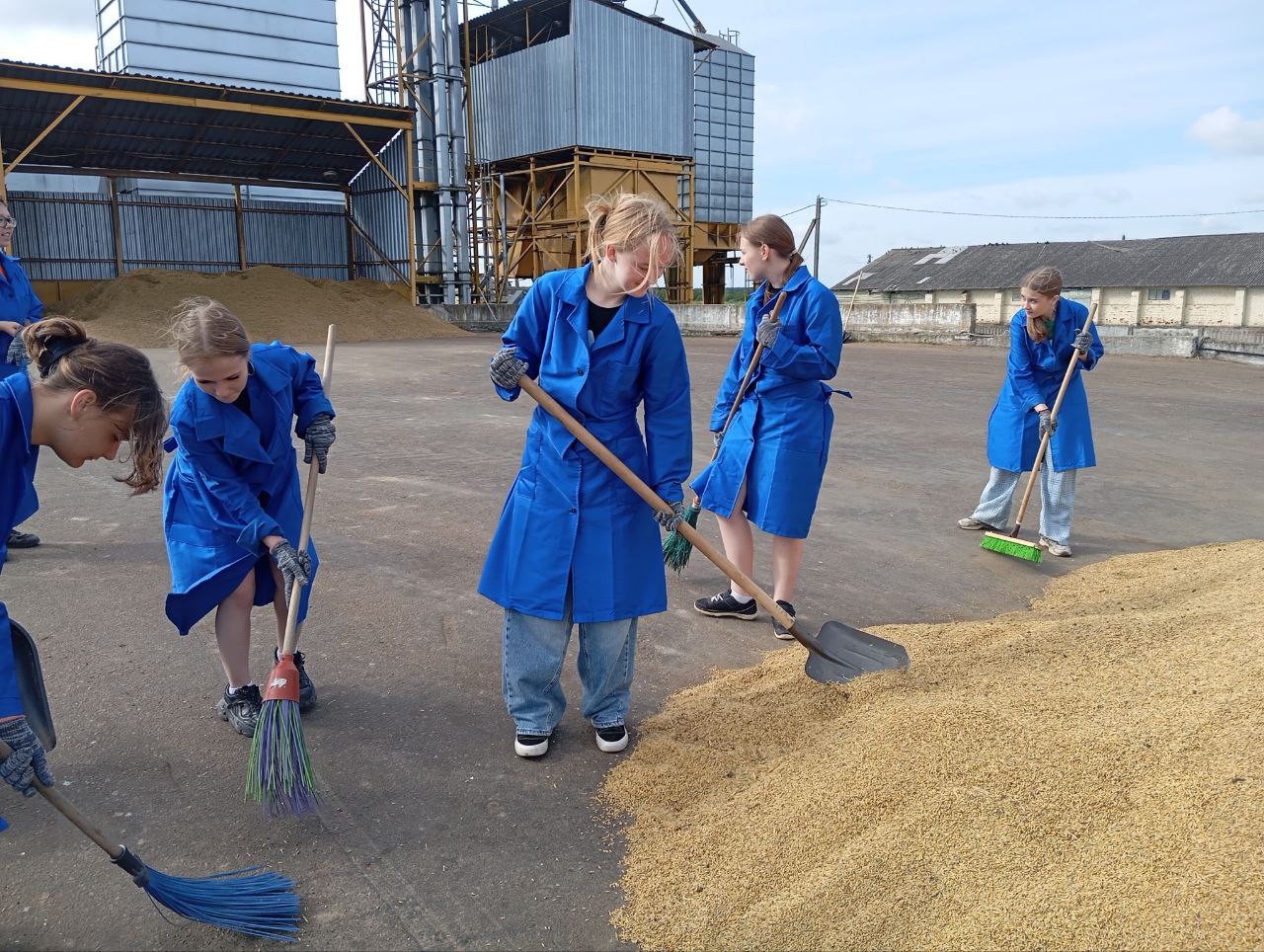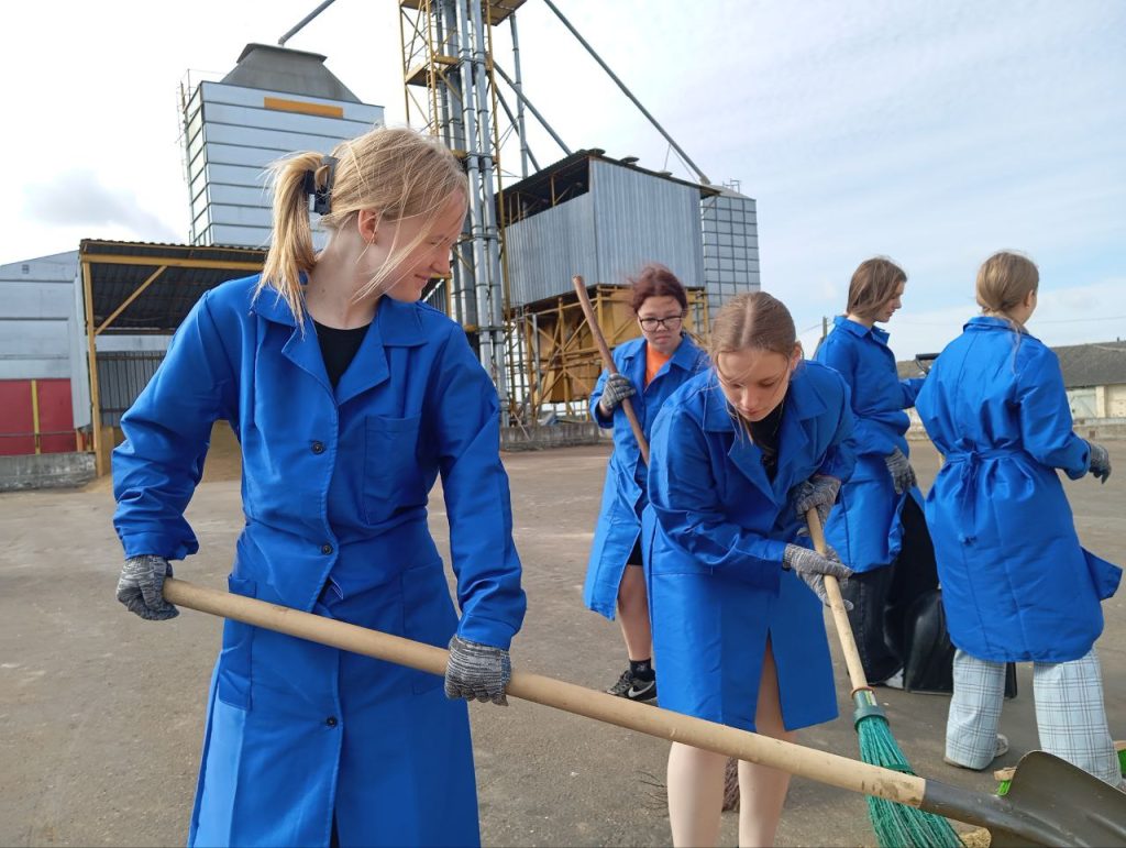 На працягу двух тыдняў будзе працаваць маладзёжны атрад з дзесяці былых дзевяцікласнікаў сярэдняй школы #2 імя Героя Савецкага Саюза Рамана Кудрына на зернесушылцы аддзялення «Рассвет» КУВСП імя Маркава. Юнакі і дзяўчаты падмятаюць тэрыторыю, выдаляюць смецце, дапамагаюць вяскоўцам спраўляцца з працэсам захавання зерня.