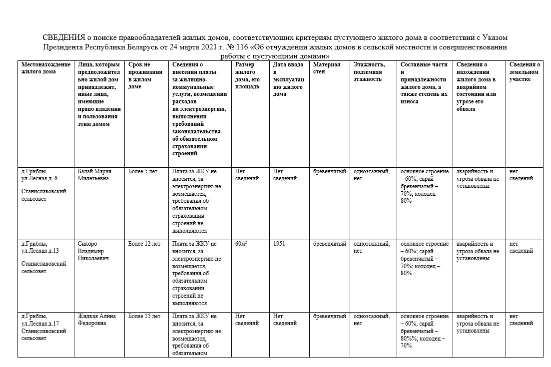 Извещение о наличии оснований для признания жилых домов пустующими (Станиславовский сельсовет)
