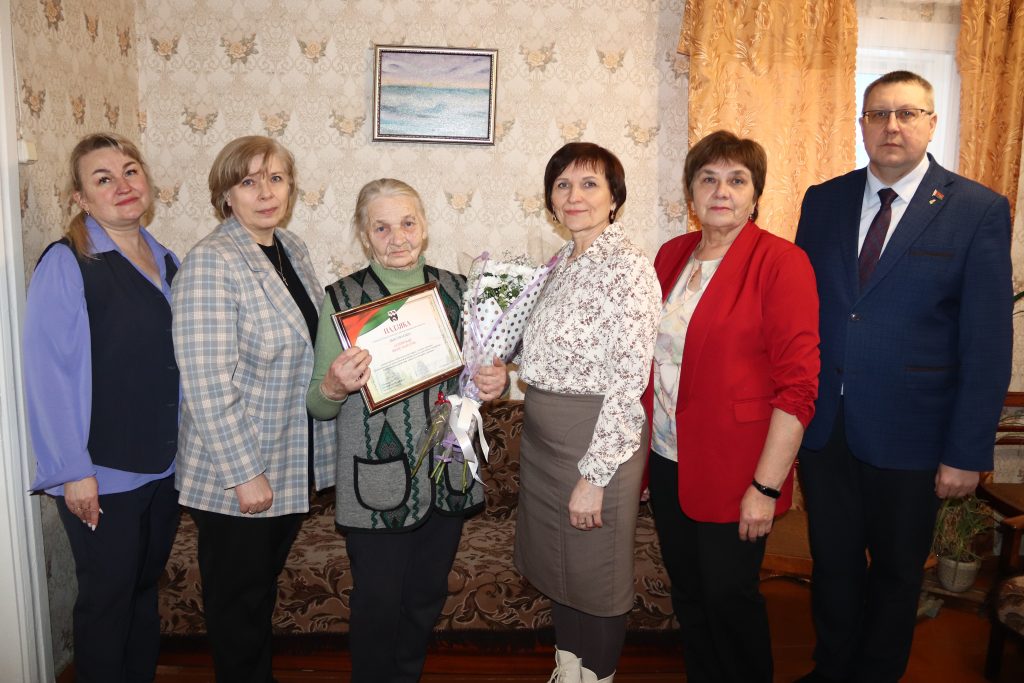 Со знаменательной датой ее приехал поздравить заместитель председателя райисполкома Юрий Василевский, который пожелал юбилярше крепкого здоровья и благополучия, вручил Благодарность председателя райисполкома.