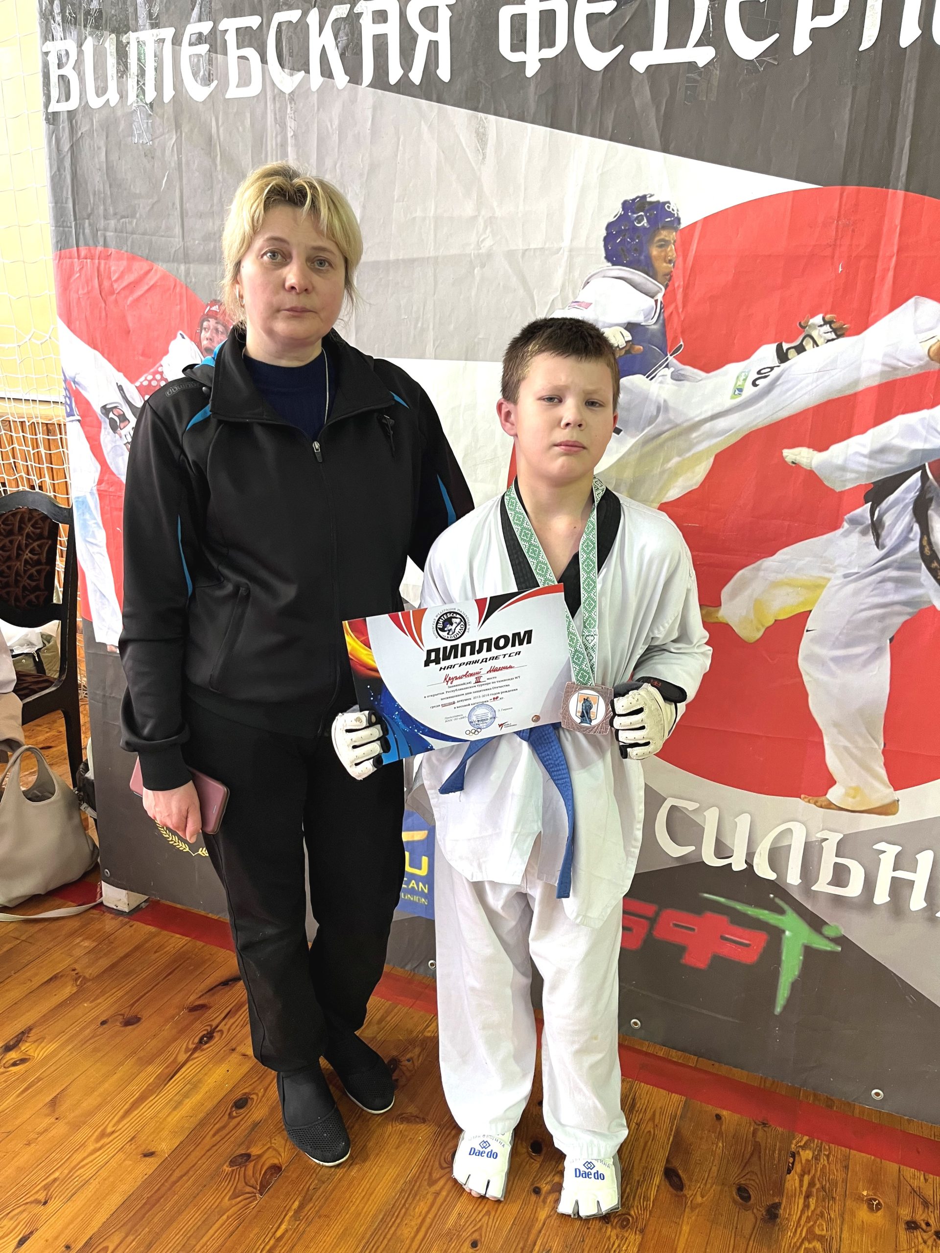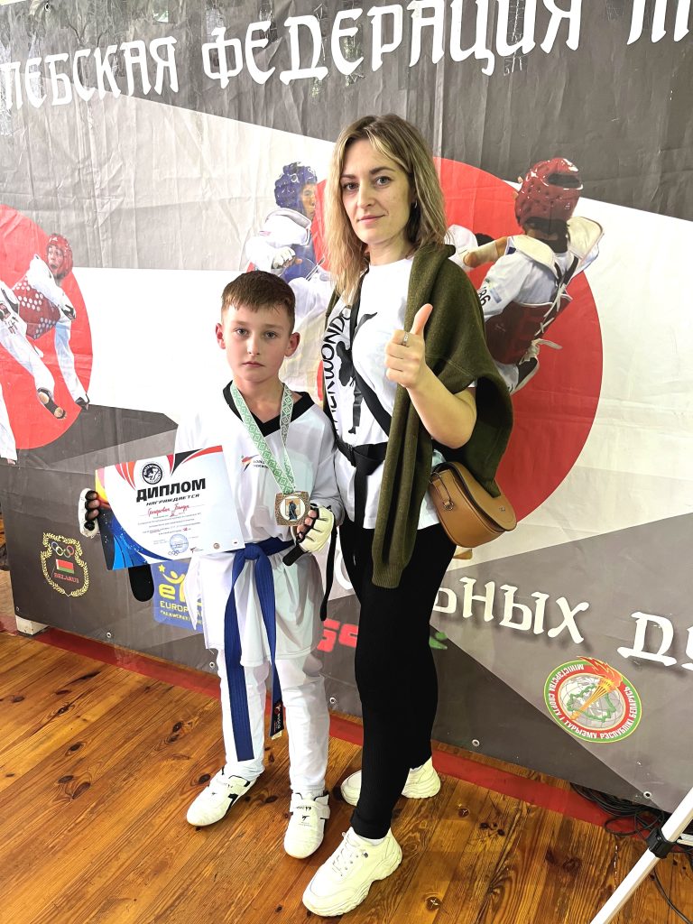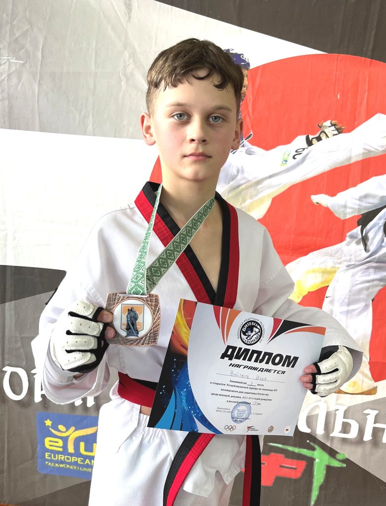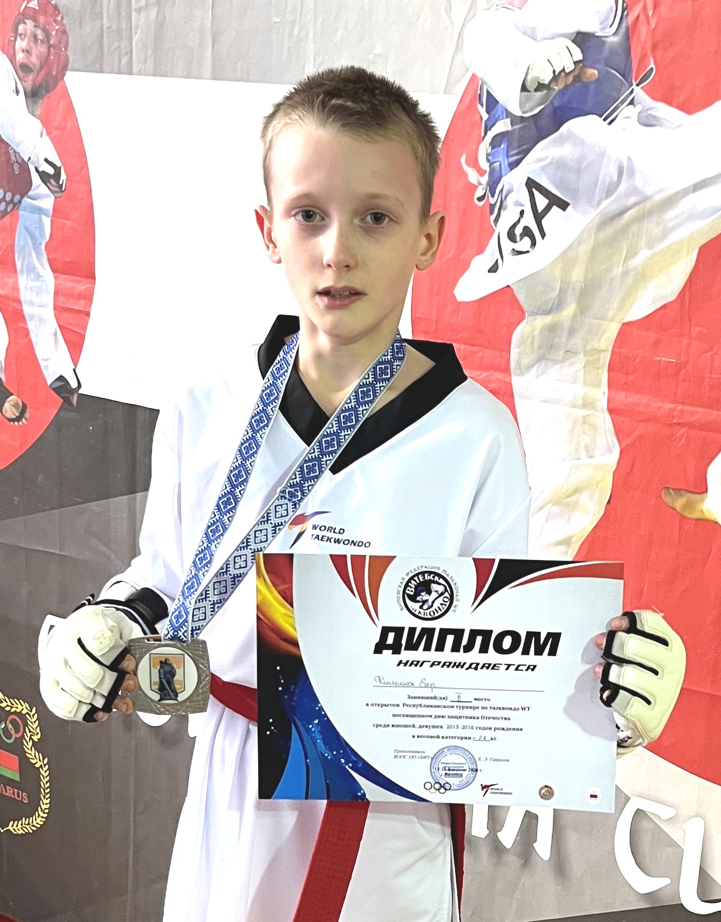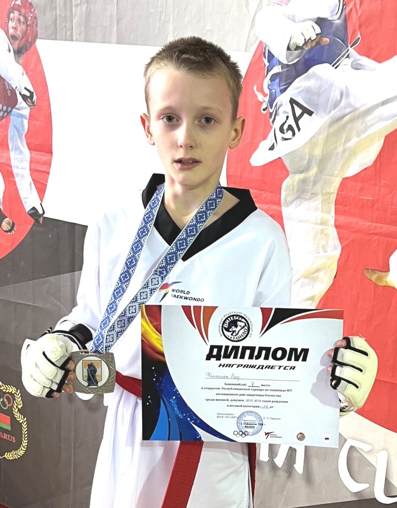 У кадетов 2012-2014 года рождения в весе 33-37 кг отличился Илья Войтюль, одержавший победы над тремя сильнейшими таэквондистами Беларуси, в том числе и над сыном очень сильного минского тренера! Наградой за это ему стали новые атрибуты успеха – Диплом 3 степени и медаль.