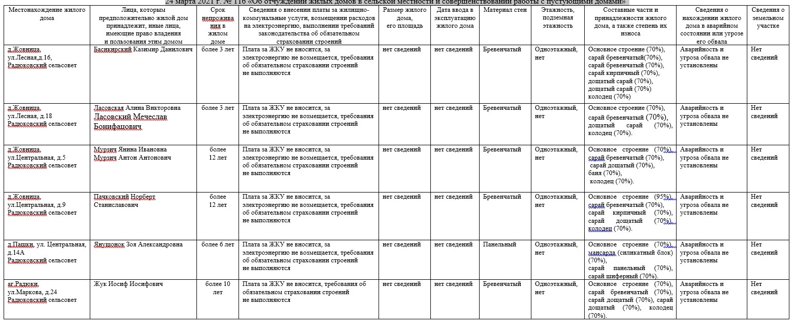 ИЗВЕЩЕНИЕ о наличии оснований для признания жилых домов пустующими, а также СВЕДЕНИЯ о поиске правообладателей жилых домов, в соответствии с Указом Президента Республики Беларусь от 24 марта 2021 г. № 116 «Об отчуждении жилых домов в сельской местности и совершенствовании работы с пустующими домами»