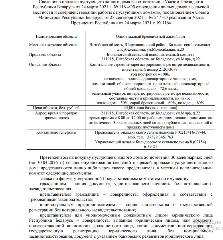 Сведения о продаже пустующего жилого дома в соответствии с Указом Президента Республики Беларусь от 24 марта 2021 г. № 116 «Об отчуждении жилых домов в сельской