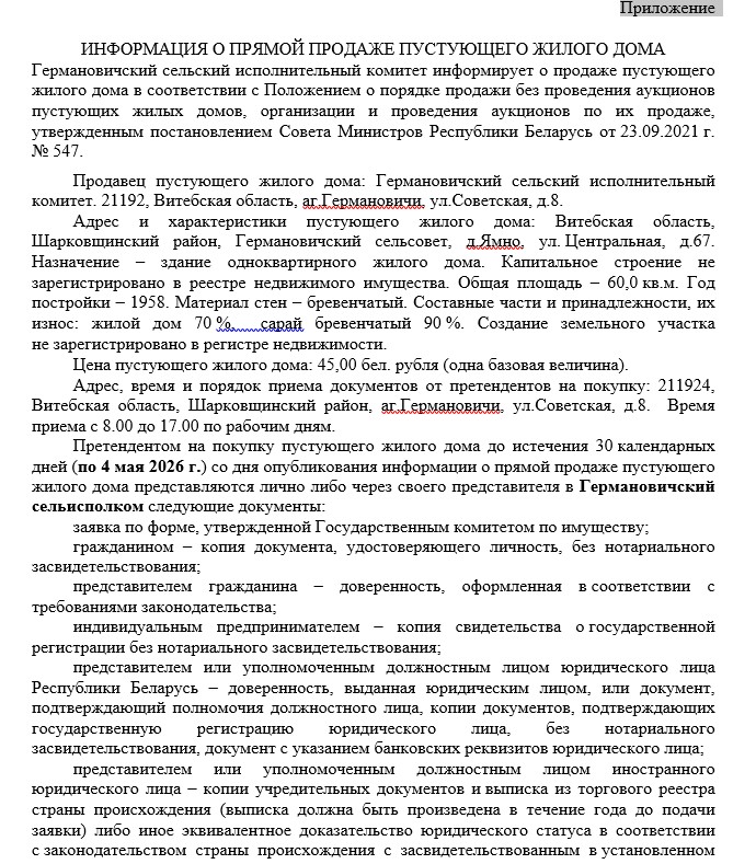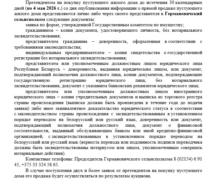 Германовичский сельский исполнительный комитет информирует о продаже пустующего жилого дома в соответствии с Положением о порядке продажи без проведения аукционов пустующих жилых домов, организации и проведения аукционов по их продаже, утвержденным постановлением Совета Министров Республики Беларусь от 23.09.2021 г. № 547.