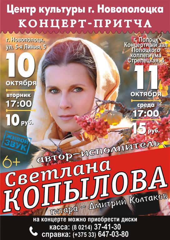 В эти октябрьские дни Светлана Копылова привозит в Беларусь новую программу. Концерты пройдут только в нашем регионе. Мы приглашаем всех желающих побывать на этом празднике. Концерт обещает быть особенным и очень интересным!