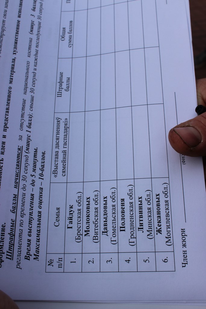 Шесть молодых семей, победивших в областных этапах, приняли участие в непростом состязании, где им предстояло проявить все свои навыки в ведении хозяйства. Так, во время конкурса «Па дровы» участники пилили, кололи и укладывали дрова в поленницу. Во время испытания «Вясковая эстафета» супруга ловила кур и садила их в клетку, затем вместе с мужем и детьми перебирали овощи и клали их в ведра, далее муж в бочке с водой должен был поймать рыбу руками. Выигрывала та семья, у которой на секундомере было зафиксировано наименьшее затраченное время и ни одного штрафного балла.